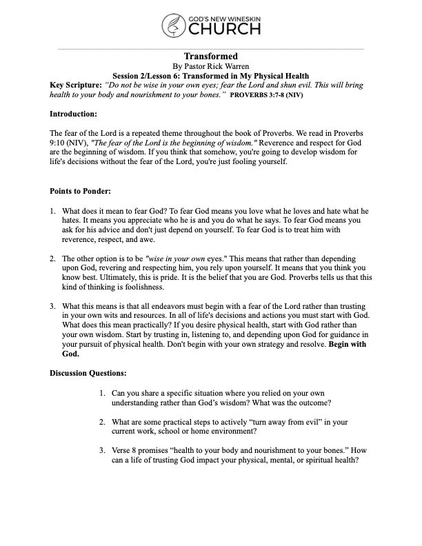 Key Scripture: "7 Do not be wise in your own eyes; fear the Lord and shun evil. 8 This will bring health to your body and nourishment to your bones." -Proverbs 3:7-8 NIV